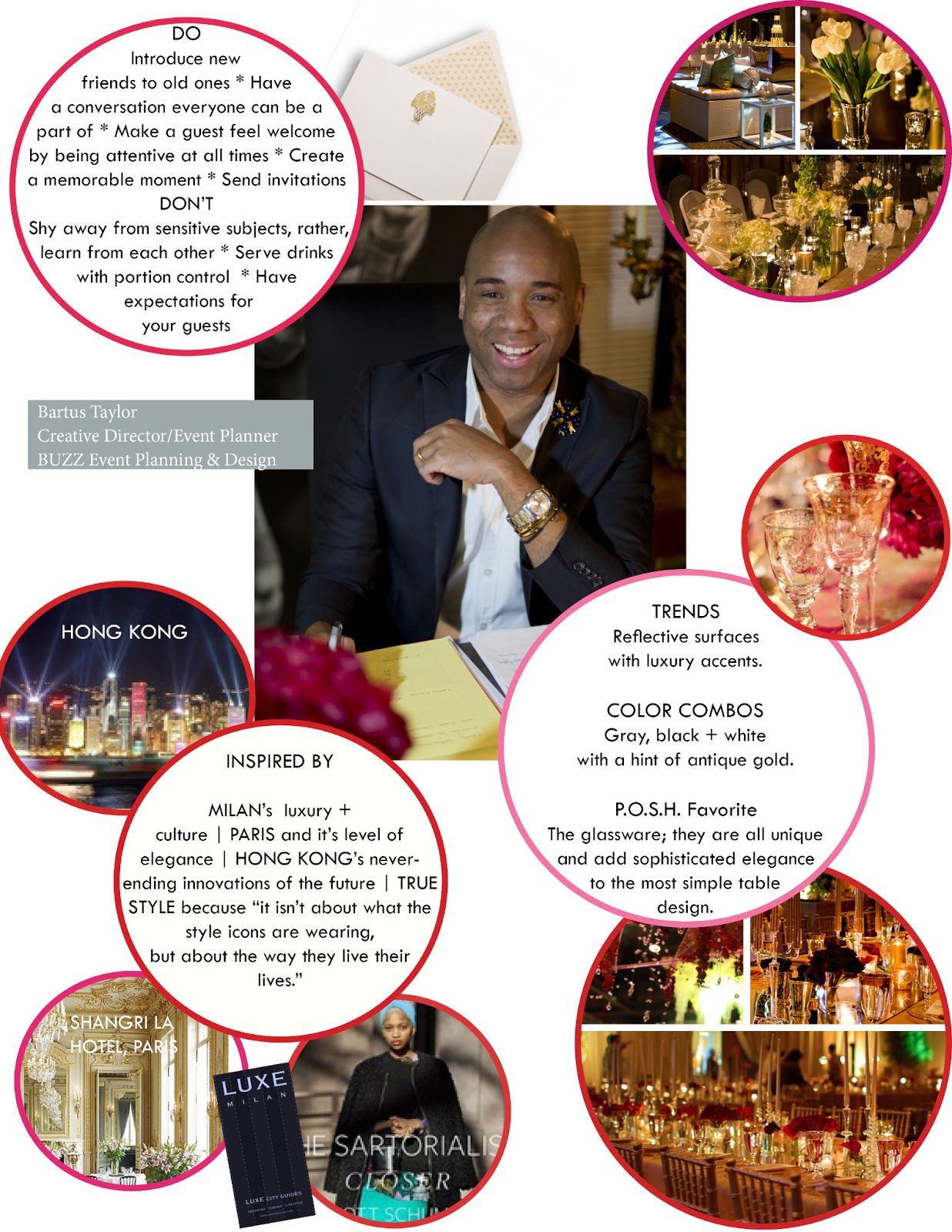 Events. His personal style comes through everything he does, from his events and tabletops to his dress and even the way he presents himself through emails. When you want to collaborate with a visionary mind for a truly original idea, Bartus is your man. He won't be afraid to try new trends, but he is also has a strong understanding of why the classics work and isn't afraid to uphold tradition (and why not, when it works?). While we were positive of his event planning skills (he did study at La Sorbonne, after all), we were thrilled at his personal hosting Do's and Don'ts as well. Bookmark these great tips for the next time your goal is to set the standard for a festive fete.
