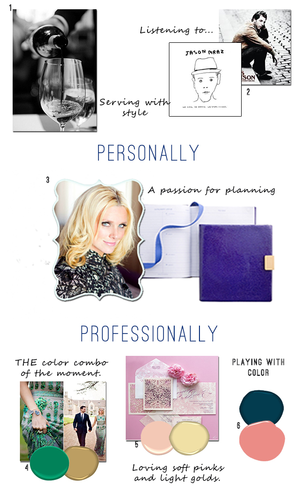 | JORDAN'S TIPS: Personally: 1. Pour the wine! 2. Play your favorite tunes. 3. Jordan and her day planner. Professionally: 4. Emerald and gold, the current cool color combo. 5. We love the gorgeous invitations from CECI NEW YORK: COUTURE LUXURY INVITATIONS. Soft pinks and golds are a favorite for weddings. 6. Think of the unexpected with Sapphire Blue and Coral color combos. |