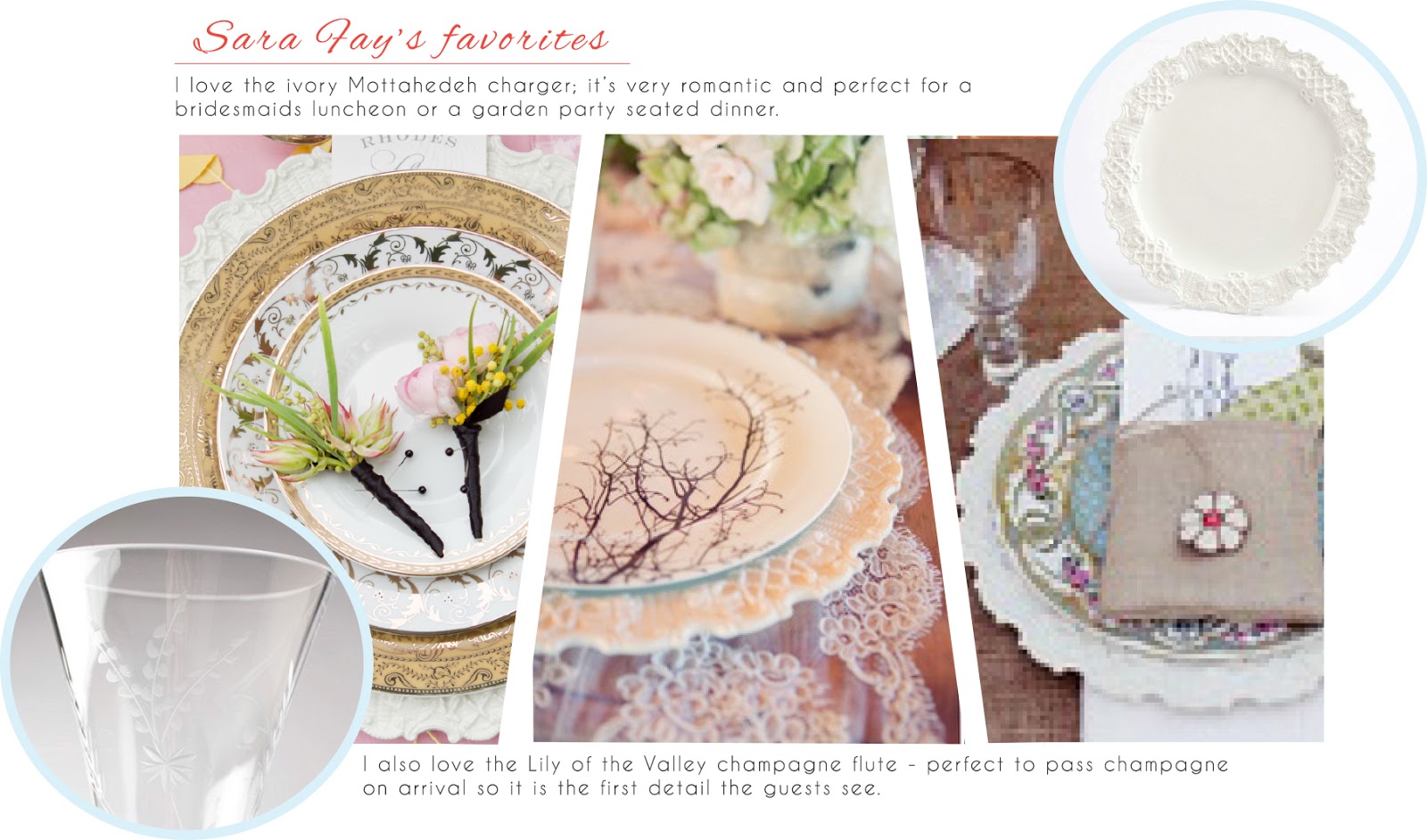 What is your favorite rental item from POSH?... I love the Mottahedeh Lace Charger; it's very romantic and perfect for a bridesmaid luncheon or a garden party seated dinner. We also love the Lily of the Valley champagne flute; it's perfect to pass champagne on arrival so it's the first detail guests see.