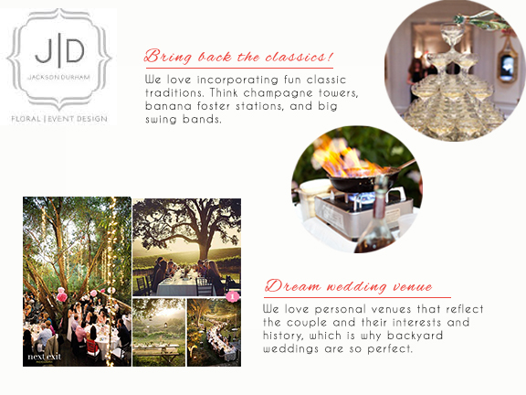 What trends do you see being big in 2013?... Bringing back the classics! We love incorporating fun, classic traditions like champagne towers, banana fosters stations, and big swing bands!