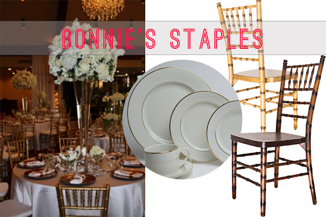 | Left, a Imagine If wedding. Right, Simply Ivory China Collection, Natural and Fruitwood Grand Chiavari Chairs. |