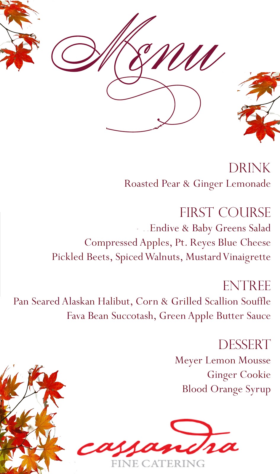 It really is the simple things that make us happy. Enjoying a hot cup of coffee in the Fall weather? Yes, please. We also love simple but great ingredients that make up a magnificent menu, which is why we had to share this Fall feast from the cool culinary minds at Cassandra Fine Catering. We can't wait to try the roasted pear and ginger lemonade.