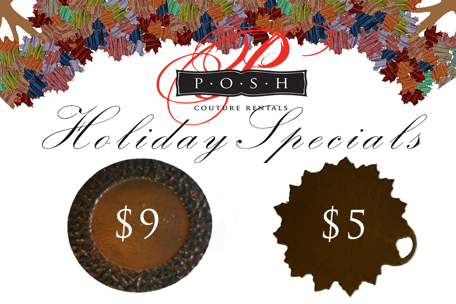 *Fall Holiday Special: (10/29/12 – 12/31/12) The following prices are valid for events held by 2013: The Jan Barboglio Hammered Charger for $9; Maple Leaf Charger for $5.