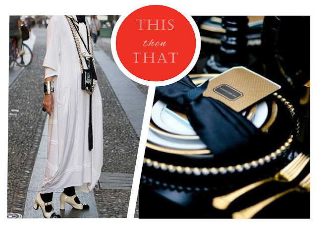 | Advanced style in black + white on one stylish lady, via here. / A POSH place setting with Silver Bead Charger, Black + Gold China, Gold Lyons Flatware. |