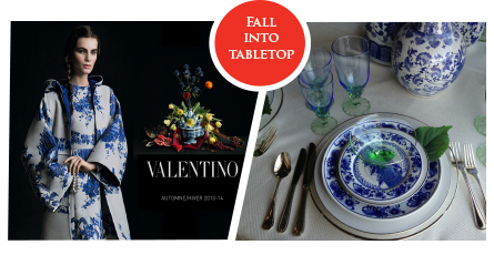 Inspired by the Valentino Fall editorial campaign, our transitional tabletops from the last days of summer to the early days of fall have a heavy blue and white feel. Valentino designers Maria Grazia Chiuri and Pierpaolo Piccioli cited Flemish paintings and "Calvinist simplicity" as inspiration for their fairy-tale sartorial 2013 collection. What we take from the look (beyond just gorgeous blue and white): Let your prints do the talking when going for a more minimalist feel. One gorgeous china pattern with a stunning accent goblet may be all you need for a modern tabletop. This is perfect before layering on more pieces for fall, in both your wardrobe and tablescape. Flawless.