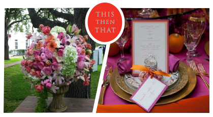 | Left, Florals by JACKSON DURHAM | Right, A Spring P.O.S.H. tabletop featuring Barcelona Gold Charger, Gold Leaf Dinner and Salad Plate, Gold Leaf Glassware, Gold Scroll Stemware, Gold Lyons Flatware, and custom hot pink and orange linens. Image courtesy of CARPE VITA PHOTOGRAPHY |