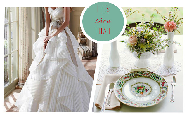 It's all in the details: The subtle stripes of the bride's gown and the Southern belle fit; the intricate floral detail of the Sevres collection and the simple designs of antique milk glass.