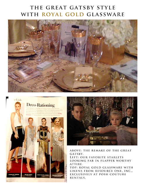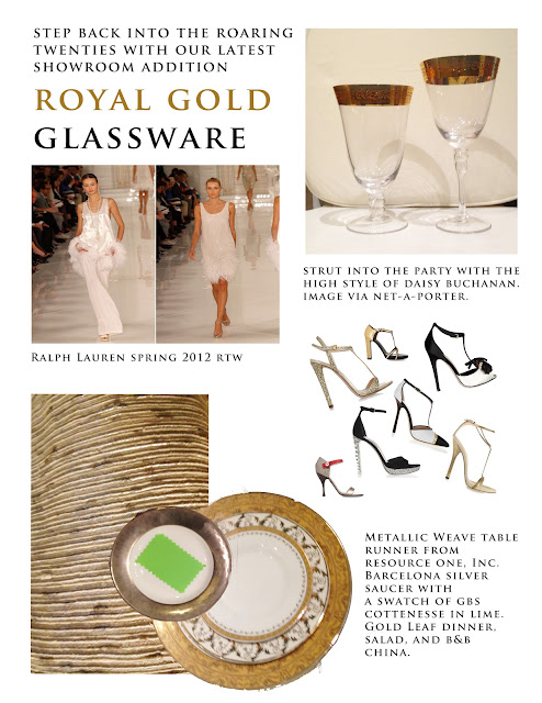 We aren't the only ones noticing the Roaring 20's trend. Pick up any magazine and you'll notice modern designs of styles made famous by flappers and socialites, including our favorite, the fictional (but fabulous) Daisy Buchanan. And aren't socialites and philanthropists really our American version of royalty? Inspired by The Great Gatsby and the latest addition to our showroom -- Royal Gold Glassware -- we're sharing our most recent golden child mood boards. Share with us how you would use these beauties.