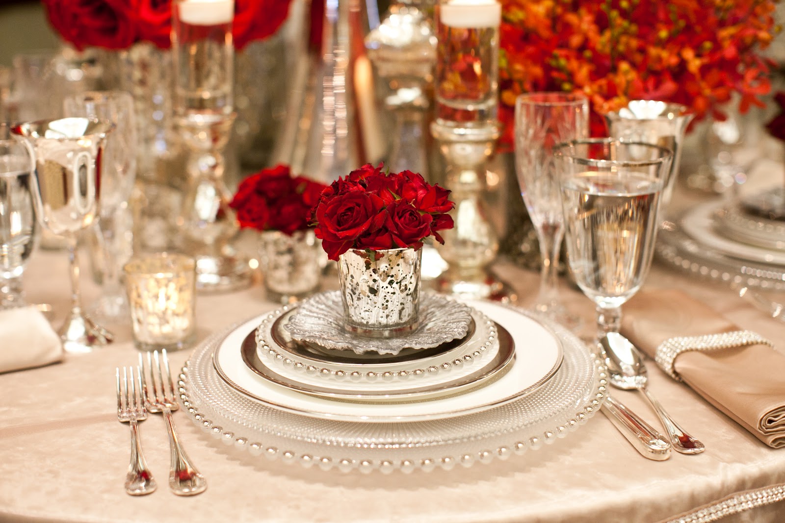 | Silver rimmed china and stemware paired with silver beaded chargers atop Champagne Hammered Velvet equals serious elegance. |