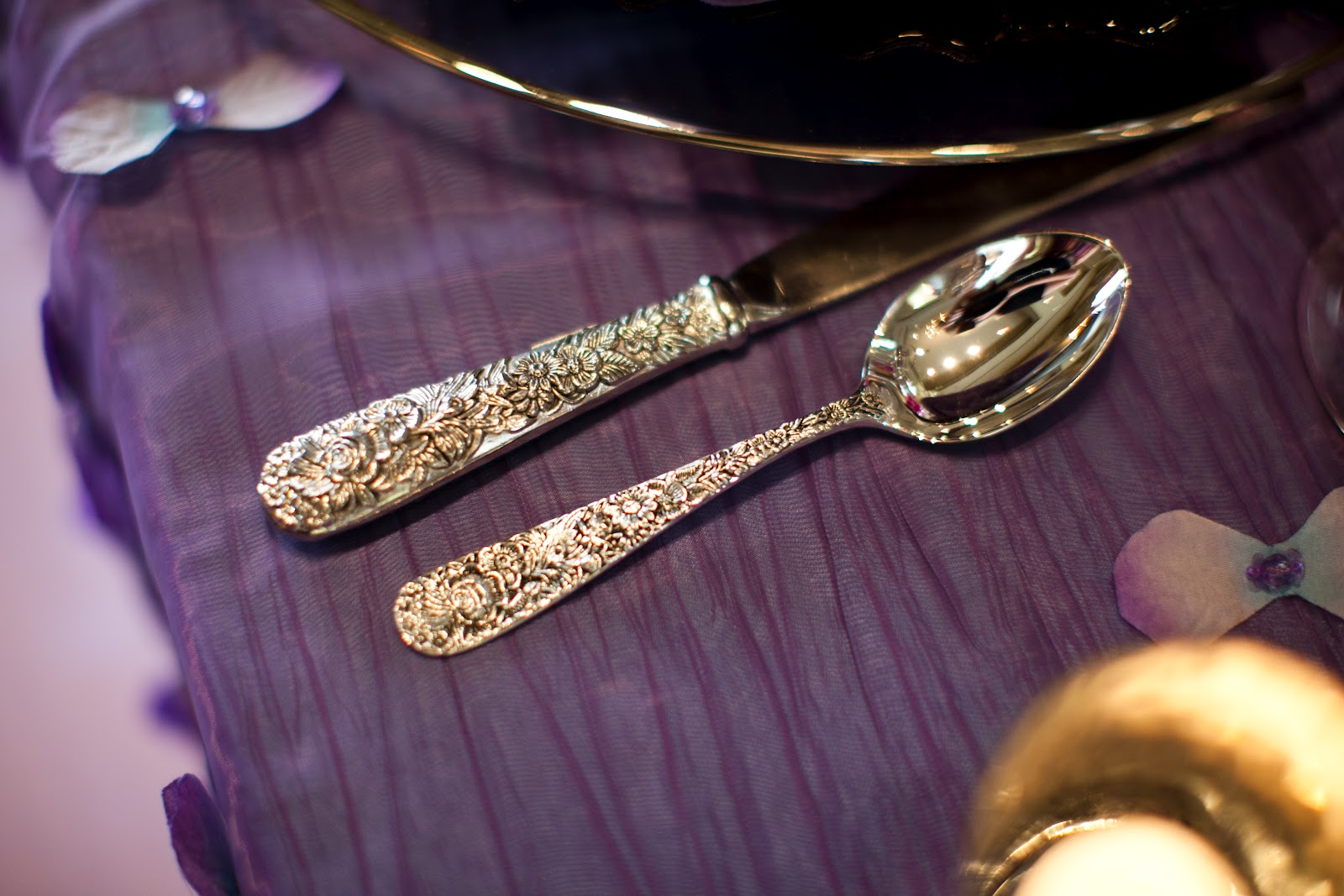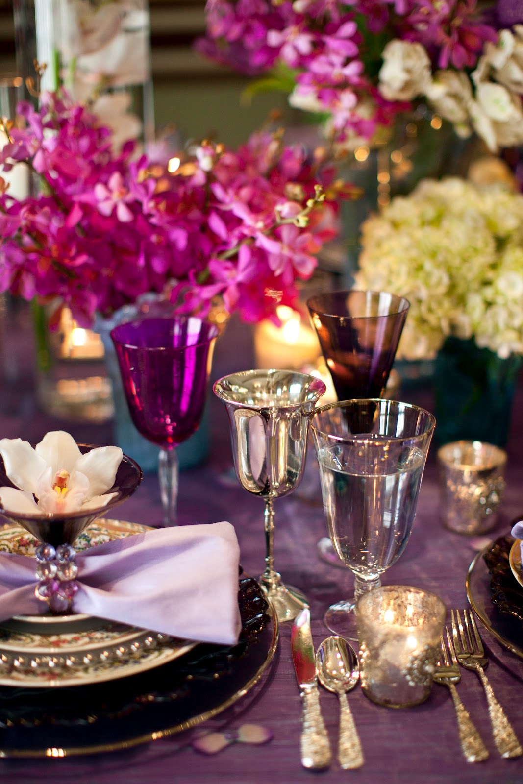 | With its unique shape and texture, the purple metallic charger sets the foundation for the Sevres china. The Lilac Nu Silk dinner napkins and Amethyst diamond napkin ring are icing on the cake. |