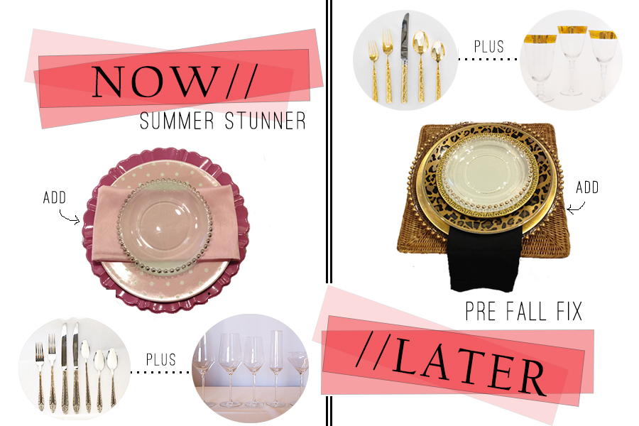 Our Summer Special allows for up to a year's worth of savings on place setting and chair rentals: Beat the summer heat by picking cool accents for midsummer soirees, engagement parties, and effortlessly chic brunches by the pool; or, stay ahead of the game with orders for the cooler months. With that in mind, we asked Jordan to pull together fun looks for both the summer and fall. From whimsical looks and bright colors for the warm months, to leopard and gold accents for fall, these P.O.S.H. place settings will have you dreaming up your next festive fete in no time.