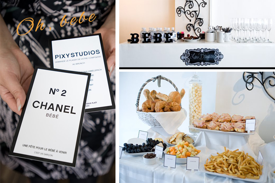 Pixy Studios threw the adorable shower above for a friend, and we're taking note. We love the nod to "bebe" number two with the Chanel No. 5 inspired invitations. If you have them, vintage Chanel pieces would be fun additions to the centerpieces. We also like the idea of milk glass on the buffet of what are undoubtedly the most craved foods - salty french fries, bread, Oreos, and donuts! See the full gallery here.