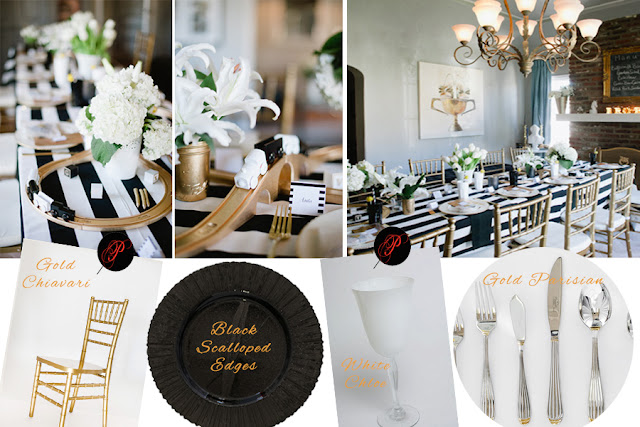 Style your own sophisticated shower with P.O.S.H.: Gold Chiavari Chairs, Black Scalloped Edge Charger, White Chloe Goblet, Gold Parisian Flatware, Milk Glass, Black + White Striped Linens, Baily Stripe in Black or White.