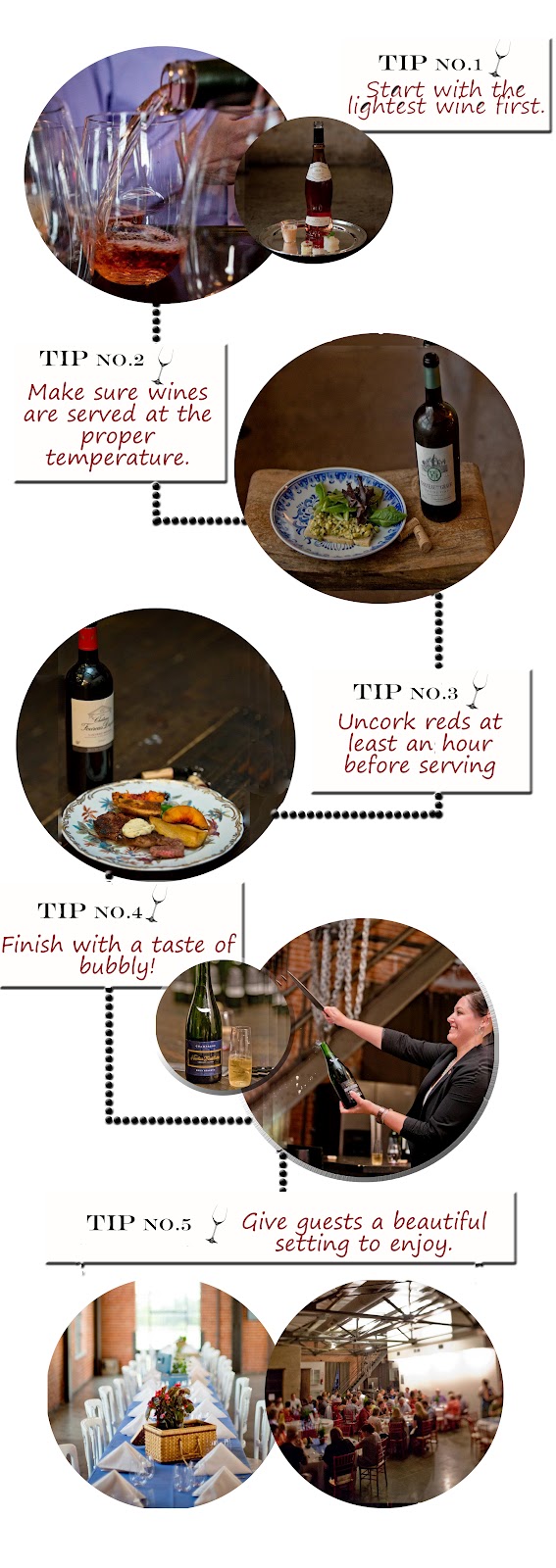 ~ For presentation purposes, pour on the right side of the guest so they can see the label, never touch the bottle to glass, and master the twist of the wrist to avoid dripping.