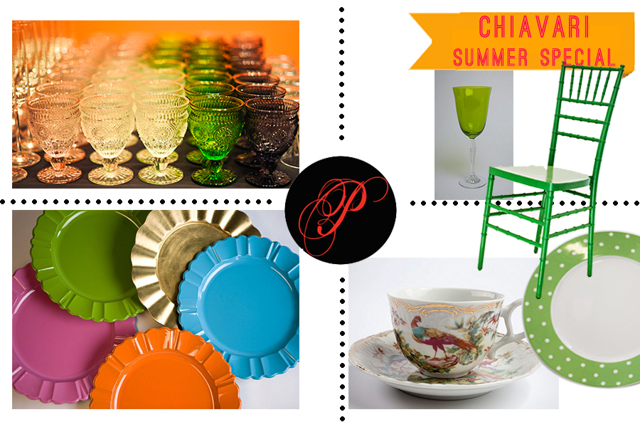 Clockwise from top right; Green Chloe Goblet, Green Chiavari Chair (now on Summer Special), Green Polka Dot China, Exotic Bird China (to bring out every color), Scalloped Acrylic Chargers in Fuschia, Lime, Tangerine, Turquoise, and Gold; Vintage Parisian Carnival Glassware in Light Pink, Clear, Green, and Purple.