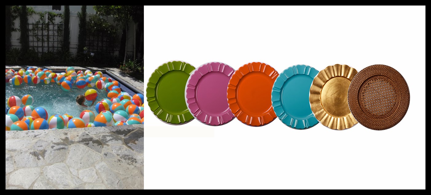 P.O.S.H. Couture Rentals Round Scalloped Acrylic Chargers in Lime, Fuchsia, Tangerine, Turquoise, Gold and Round Rattan Charger // Image via Pinterest