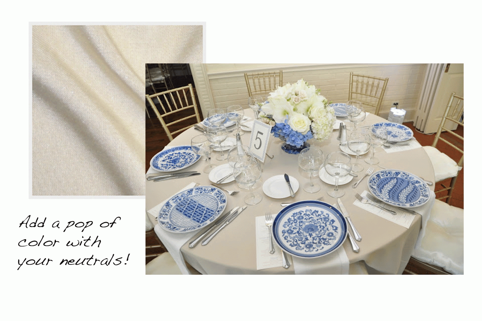 | Natural Metallic Resource One Linen. Our Blue and White China adds a perfect pop of mix and match color. |