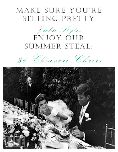 It's the favorite that works a ballroom and an outdoor wedding in a field with the same classic cool. Dress it up, choose a bold color, or just let the chiavari speak for itself with natural coloring. We've talked about our love for the chiavari chair before, and now we're spreading the love with one of our Summer Steals. Order and place a deposit for your chiavari by August 31, 2012, and get each chair at a special $6 price on events now throughout 2012. Take your pick of red, green, silver, gold, black, ivory, fruitwood, and natural with your choice of black, ivory, or white cushions. At this price, what are you waiting for?