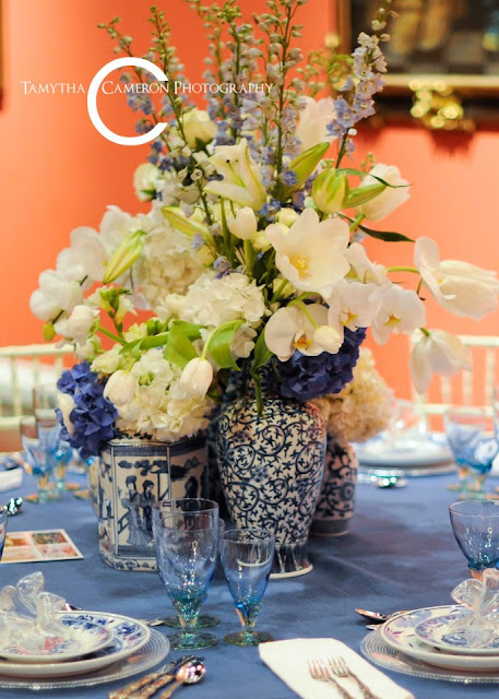 This is a gorgeous formal tablescape designed for the SMU Meadows Museum grand opening (read more about here). Opulent centerpieces and cut crystal chargers keep an air of luxury. For a more casual affair, keep the gorgeous glassware but switch out the linens and use rattan chargers. Any way you set the table with blue and white china is bound to be a crowd-pleaser.