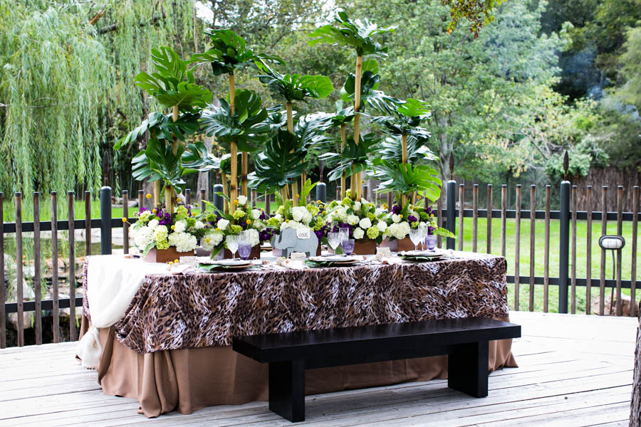 | We love that the exotic theme of the zoo made it to the tabletop. The palm leaf centerpiece makes just as much of a statement as a bold animal print. |