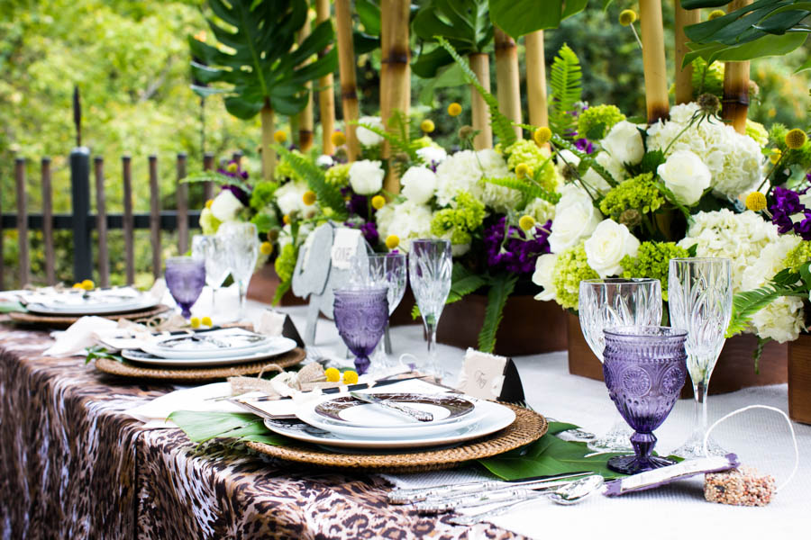 | Top, The breakdown of a gorgeous place setting. We love how the jute linens compliment the natural texture of the wild and add a neutral hue to the animal print. |