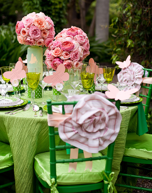 Continuing the D Weddings Fall 2012 series of asking wedding planners to create a tablescape for their ideal client, A Stylish Soiree chose Georgia O'Keeffe. This modern artist came to largely represent the American Southwest with her compelling landscapes and cultural body of work. Floral centerpieces that appear to be floating above the table, green landscapes and a setting in the outdoors would be O'Keeffe approved. We love the modern take Stylish Soiree took by incorporating green polka dots.