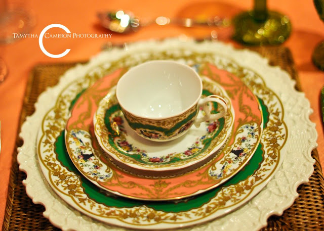 | Layering isn't just for Fall: Square Rattan Charger, Mottahedeh White Lace Charger, Sevres China Dinner, Salad, Teacup and Saucer |