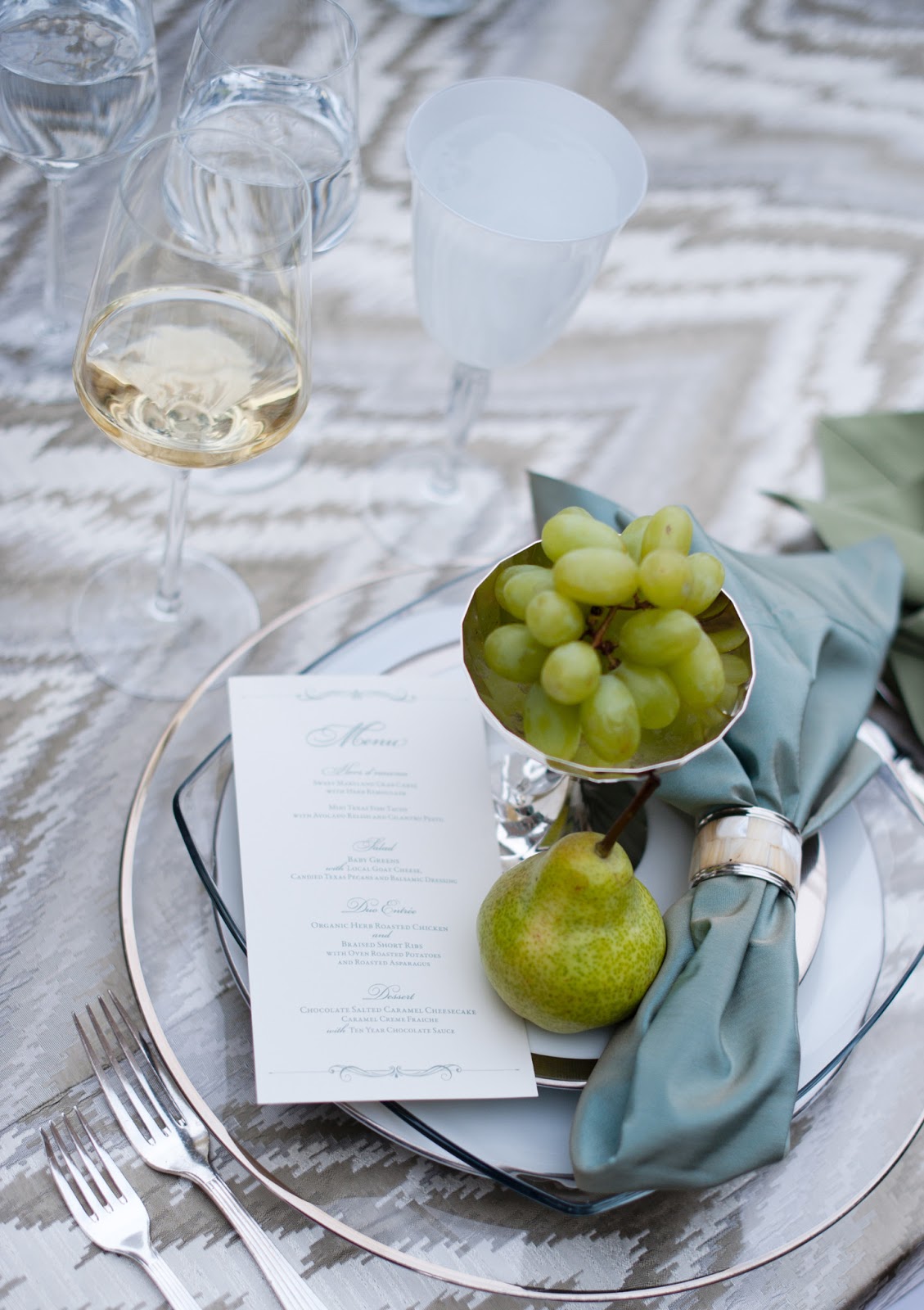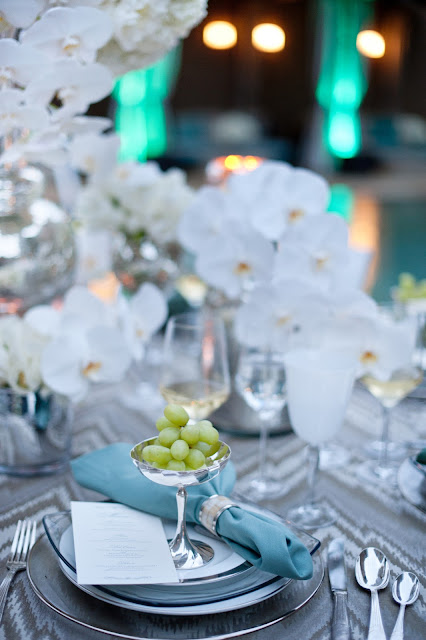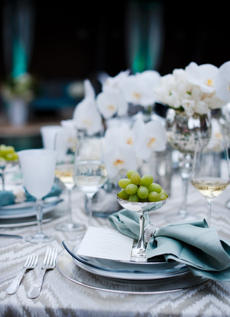 | Serve it up: White Chloe Goblet, Pure Stemware, Silver Rimmed Glass Charger, Simply Platinum Dinner Plate, Rounded Square Glass Salad Plate, Barcelona Silver B&B Plate, Parisian Flatware, Mother of Pearl Napkin Ring |