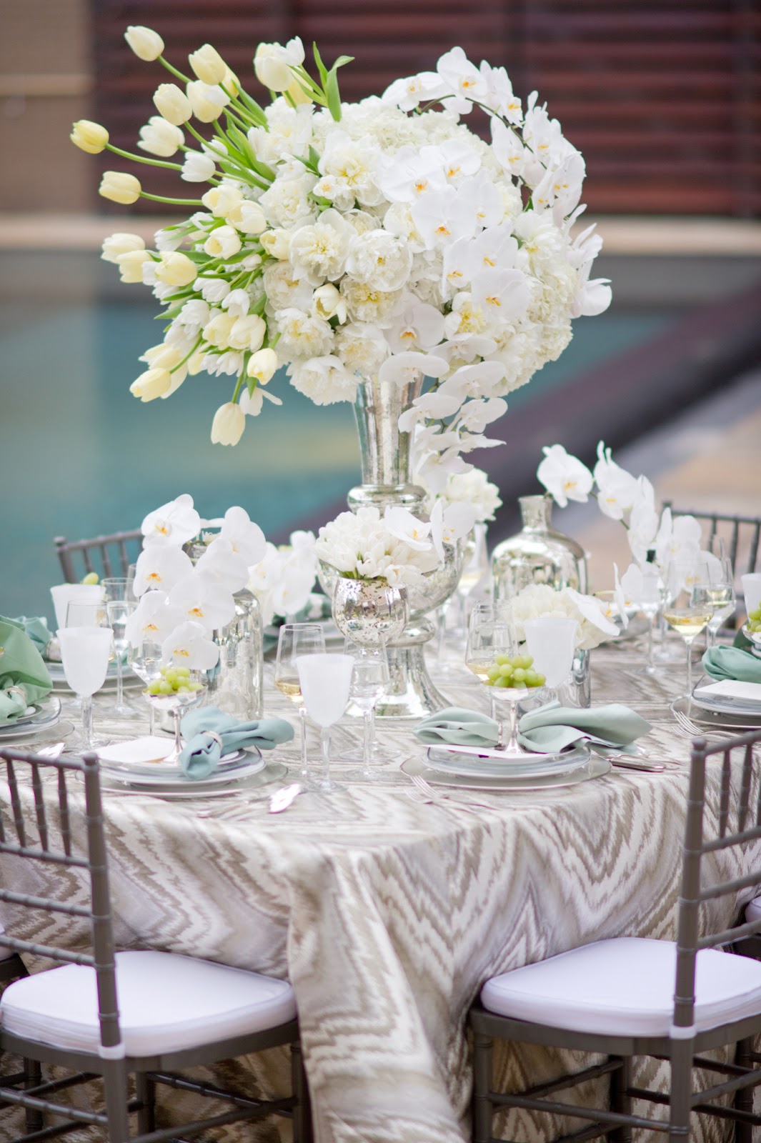 | Dreamscape: A beautiful take on shades of (pewter) and gray with Pewter Chiavari Chairs and a fabulous La Tavola linen. |