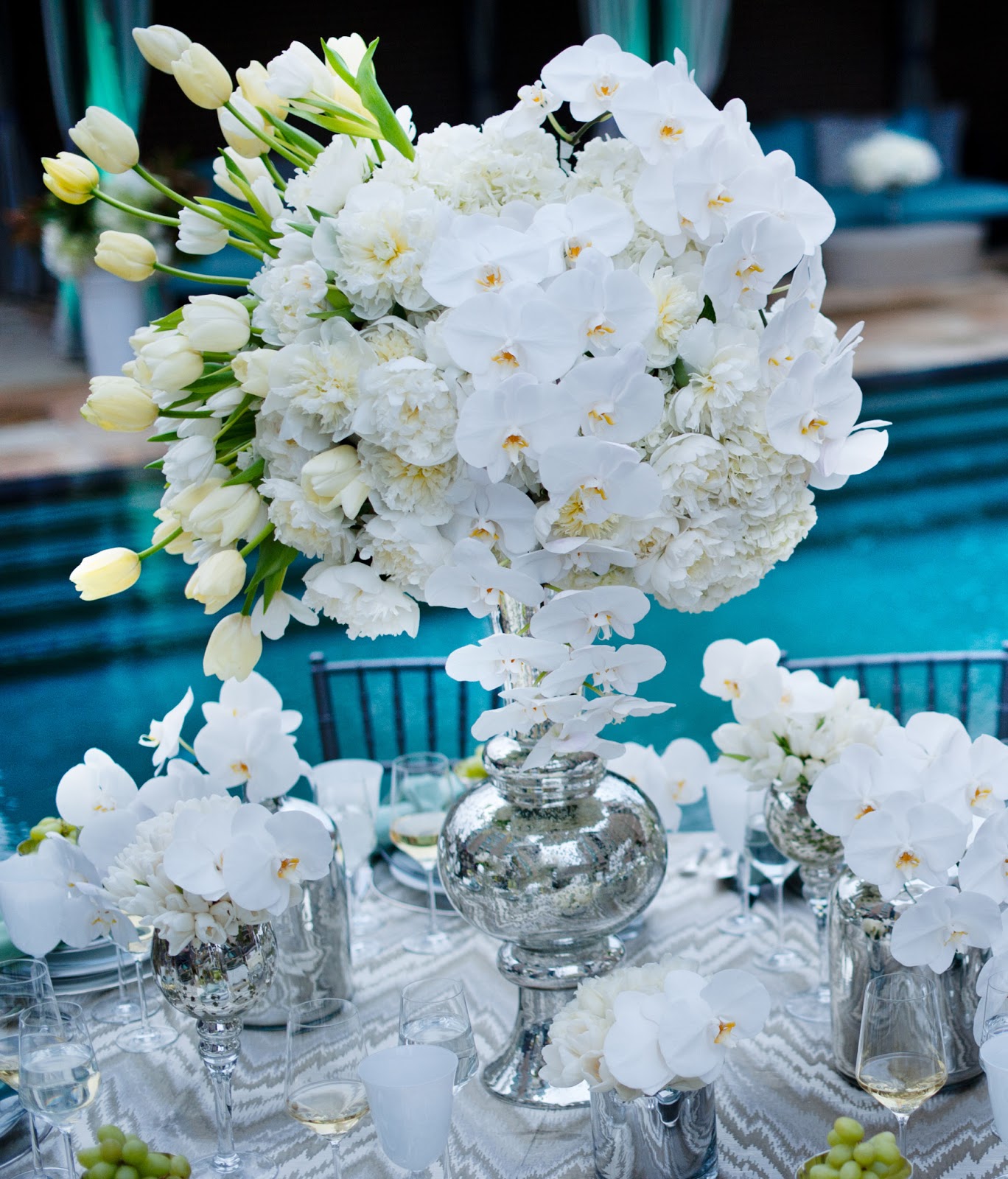 A tabletop that has us singing "A Whiter Shade of Pale" / A stellar linen pattern / Simply yet stunning stacked plates / A delicate compote for serving fun dishes / A purely dazzling arrangement of all white flowers