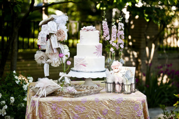 | A cake table brought to life with amazing paper goods, personal touches, and a fantastic linen. |
