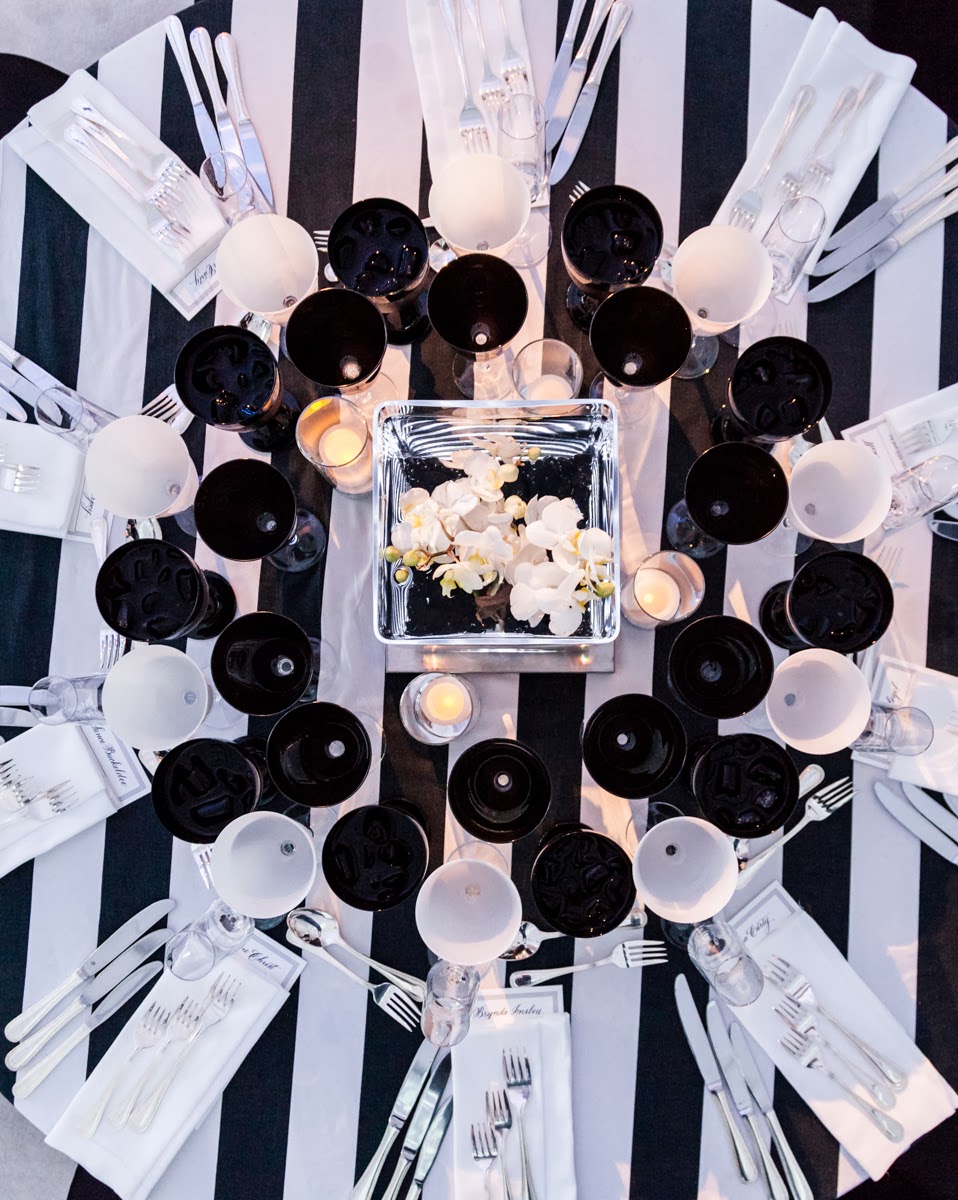 | A mixture of white Chloe goblets with Onyx and Stella black stemware on black + white striped linens from POSH Couture Rentals. Design by Todd Events. Image courtesy of Roderick Pena Photography |