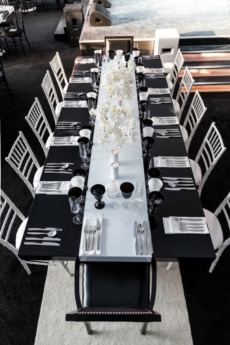 | White Chiavari Chairs, Artesian Flatware, Onyx Stemware, Black and White Chloe Goblets, Pure Stemware, all POSH. Roderick Pena Photography |