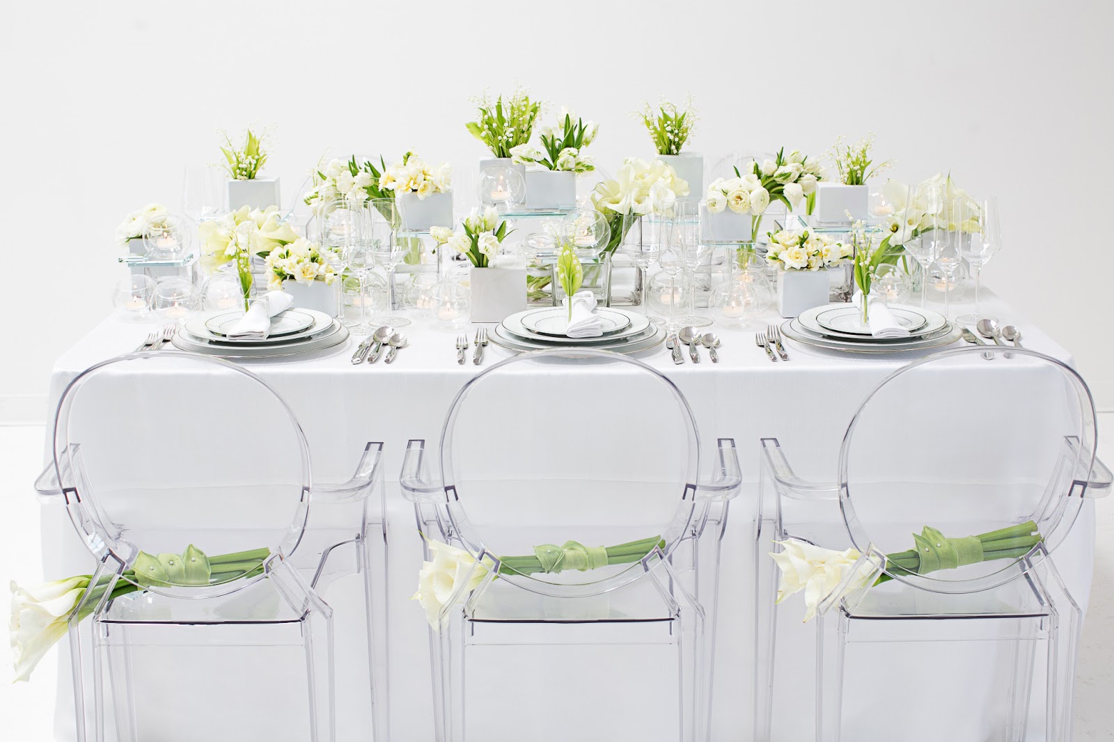 Whether she is doing a majestic hanging garden to canopy the wedding party or an ethereal centerpiece, Debby Jewesson knows a thing or two about brightening your event with flora and fauna. Published in this Spring's D Weddings issue, Debby was given the task of a white tablescape. Knowing the beauty of pure white, she kept the look simple and clean for a big impact. We love the contemporary flair of this tabletop. Can you image sitting down to what is essentially several of your own floral centerpieces? As always, Debby is ahead of the curve. See more of her work at Branching Out Floral & Event Design.