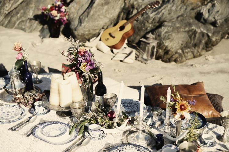 | Seaside picnic with assorted china plates and saucers. Set the tone with candles, seashells, and textured linens and blankets. |