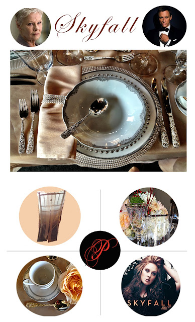 POSH Picks: (Clockwise from top left) White Organza with Double Rhinestone Trim, Chiavari Chair; Silver Lace Goblet, Silver Rimmed Water Goblet; Adelle on the cover of the soundtrack for Skyfall; Floral Elegance spoon, Loren Teacup and Saucer.
