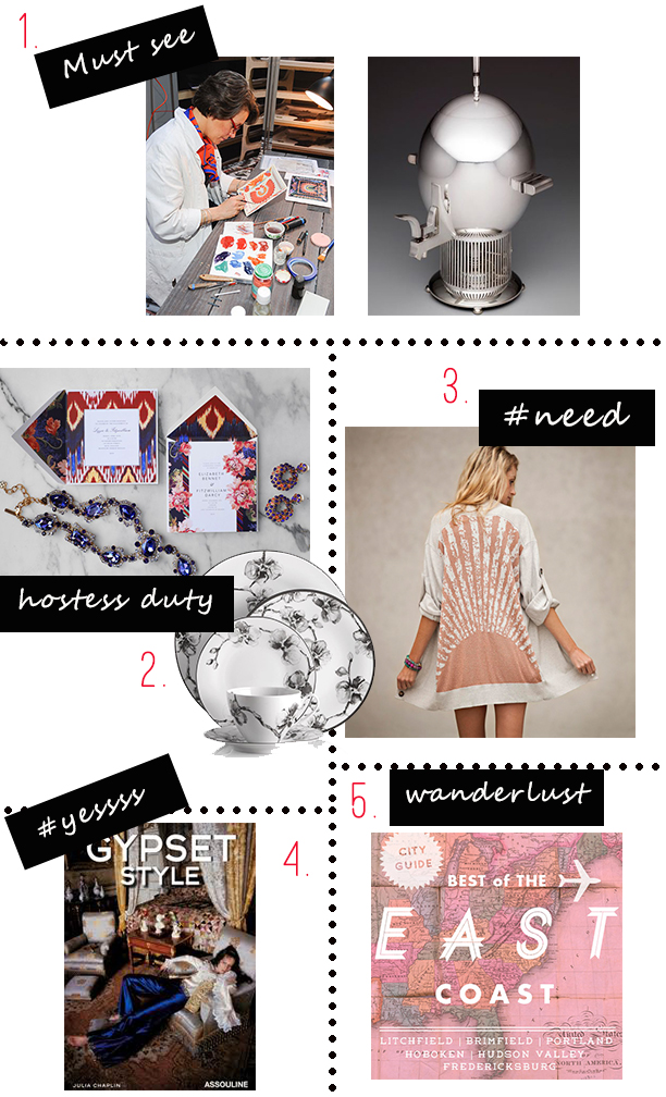 1. Whether you're in Dallas or NYC, you have something spectacular to see. Hermès is showcasing just how their iconic craftsmanship comes to life with a workshop with their talented artisans. Details here. If NYC isn't in your travel plans, have no fear. You can still see some acclaimed work. Only at the Dallas Museum of Art can you see Eliel Saarinen's precise and bold tea urn. We love a great entertaining piece that doubles as art. See it here.