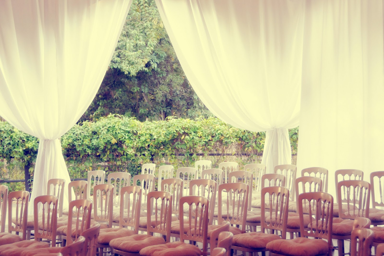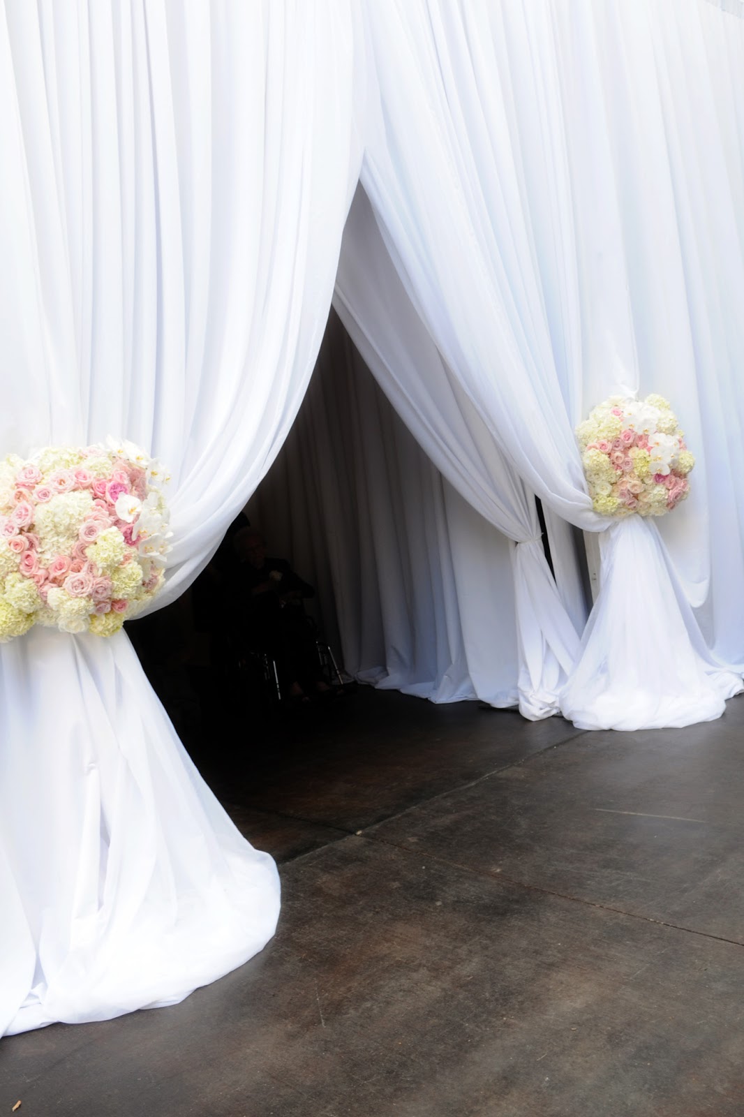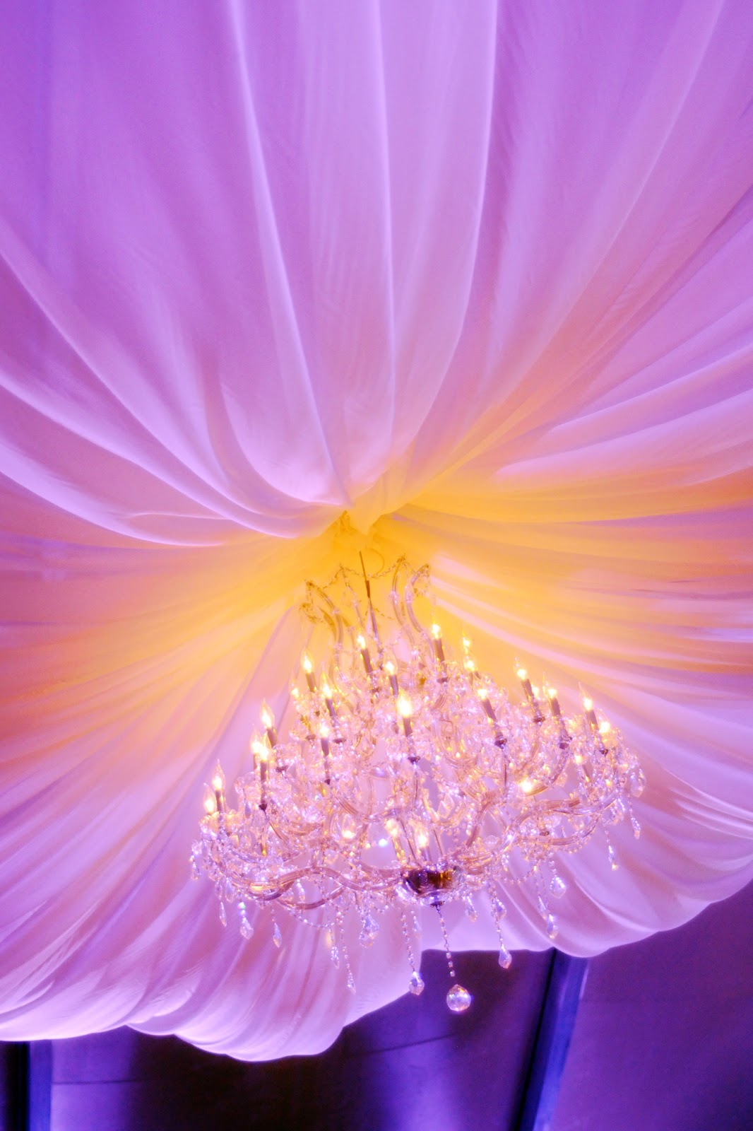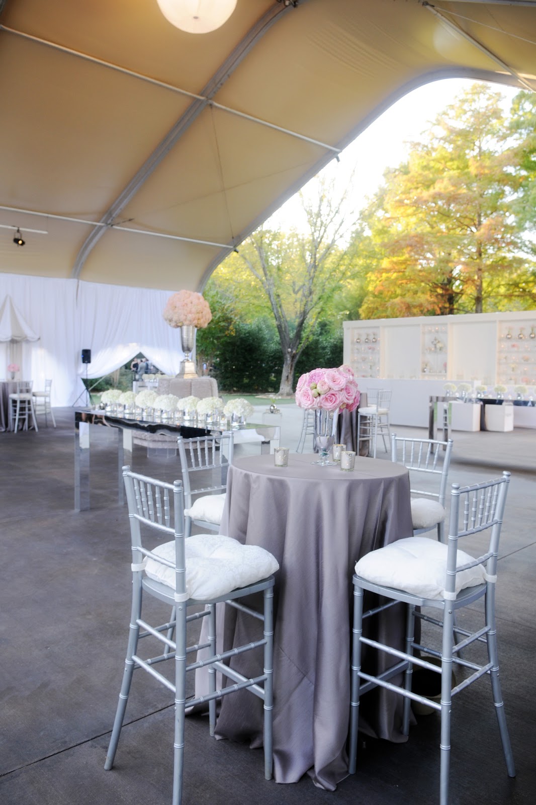 | P.O.S.H. Villa Ballroom Chairs are the perfect way to add sophistication to the tented ceremony, along with dramatic draping from Dallas Draping and Lighting. |