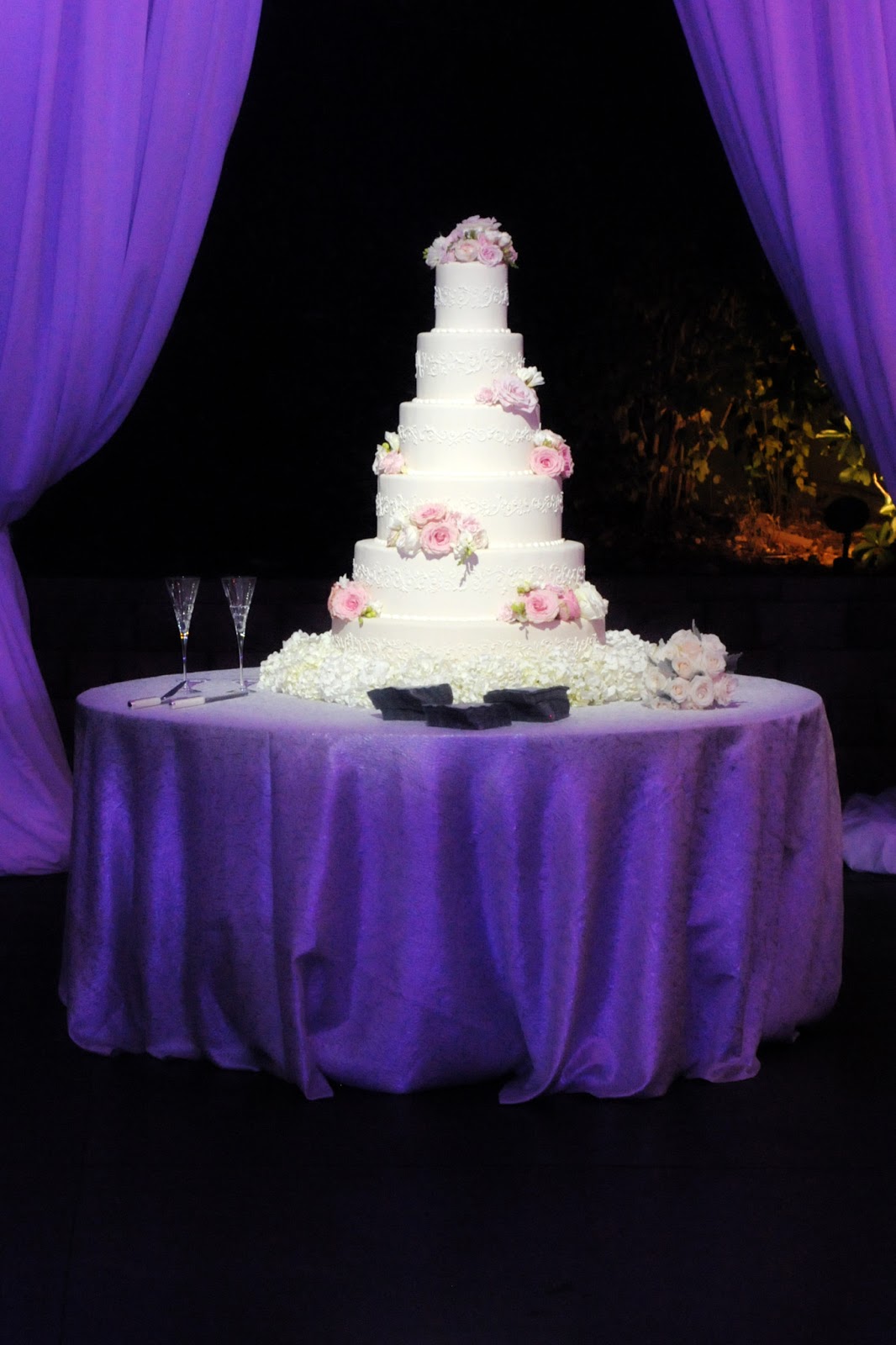 | Pewter Damask for an established cake table presenting the artistic work of Frosted Art Bakery. |