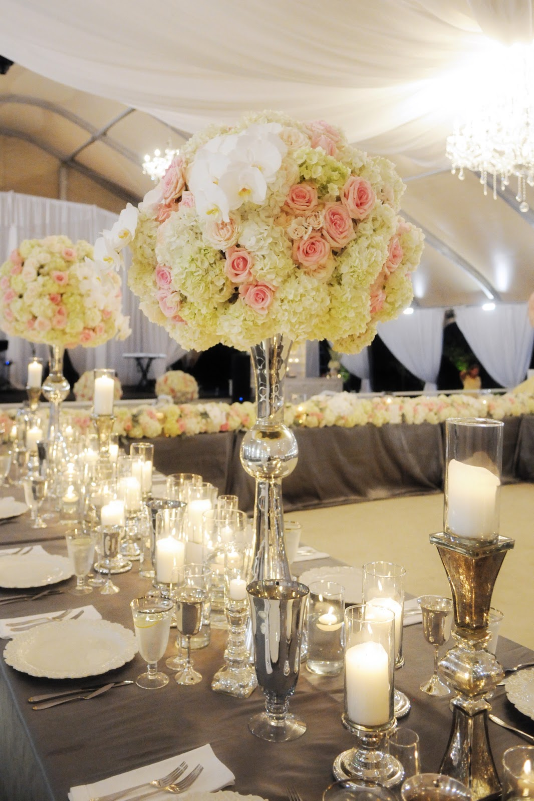 | Tabletop: Silver Goblet, Parisian Gold Flatware, Pewter Chiavari Chairs, Classico Stemware, Khaki Mandarin Nu Silk | Floral, Branching Out |