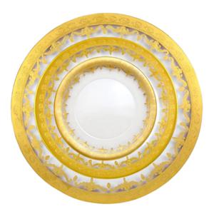 Orange and gold bring a jubilant feel to a holiday tablescape, making this perfect for Thanksgiving or Christmas. We love how the gold of the Kim Seybert Laurel Charger and Arte Italica 24K Vetro Dinner Plate perfectly highlight the elegant design of the Sacred Bird Charger. An amber glow is further accentuated by a mix of Etched Amber Glassware and Yellow Duchess Goblet, along with the Gold and Clear Lucite Flatware. This is a highly sophisticated mix that feels instantly at ease thanks to a Rattan Chair and Jute Linen.